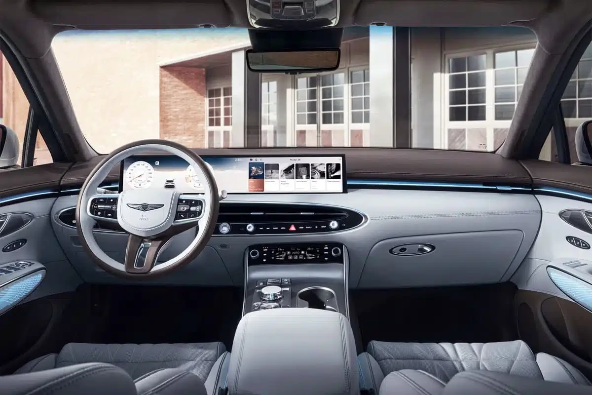 GV70 하이브리드 모델의 내부는 고급 소재와 최신 기술이 조화를 이루도록 설계되었습니다. 대시보드에는 와이드 듀얼 디스플레이가 적용되어 운전자에게 필요한 모든 정보를 직관적으로 제공합니다. 이 디스플레이는 터치와 음성 명령을 모두 지원하여 운전자가 운전에 집중할 수 있도록 도와줍니다. 또한, 무선 소프트웨어 업데이트 기능을 통해 차량 시스템을 지속적으로 최신 상태로 유지할 수 있습니다.
